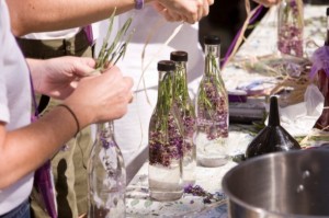 - Set up different stations for each DIY project to avoid overcrowding in one area. Organize tables with all the containers, ingredients, and measuring utensils laid out in order of assembly. Tip: Use white plastic tablecloths and write instructions by each step with a black permanent marker.
